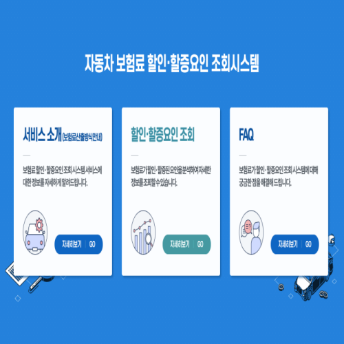 자동차보험료할인/가산계수조회시스템_우대/가산계수조회 자동차보험할인/가산계수조회 시스템서비스소개(보험료계산방법안내) 보험료할인/가산계수조회시스템 서비스 정보를 자세하게 소개합니다. 상세보기 GO 할인/추가 요소 검색 프리미엄 할인/추가 요소를 분석하여 상세 검색이 가능합니다. 자세히 알아보기 GO FAQ 프리미엄 할인/할증 요인 조회 시스템에 대한 궁금증을 해결해 드립니다. 자세한 내용은 GOprem.kidi.or.kr에서 확인하세요.