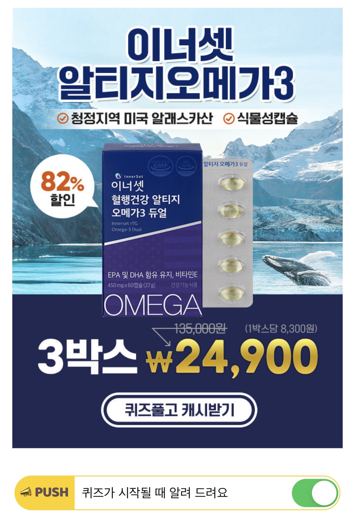 답: 오늘의 눈 보호 시크릿 특가! 셀트리온 이너랩 알티지 레드 오메가3 데일리케어의 오메가3 성분 중 EPA가 혈중 OO를 줄여주고 혈액순환을 좋게 해주기 때문에 간편식과 육류를 자주 드시는 분들께 추천드립니다. 객체지향이란? (이니셜: jij) 정답: 오늘의 하루 비밀 특가! 셀트리온 이너랩 알티지 레드 오메가3 데일리케어에는 OOOmg 오메가3가 체내에서 충분히 합성되지 않아 외부에서 섭취해야 하는 성분이 함유되어 있습니다. OOO에는 어떤 숫자가 들어가나요? 답: 600