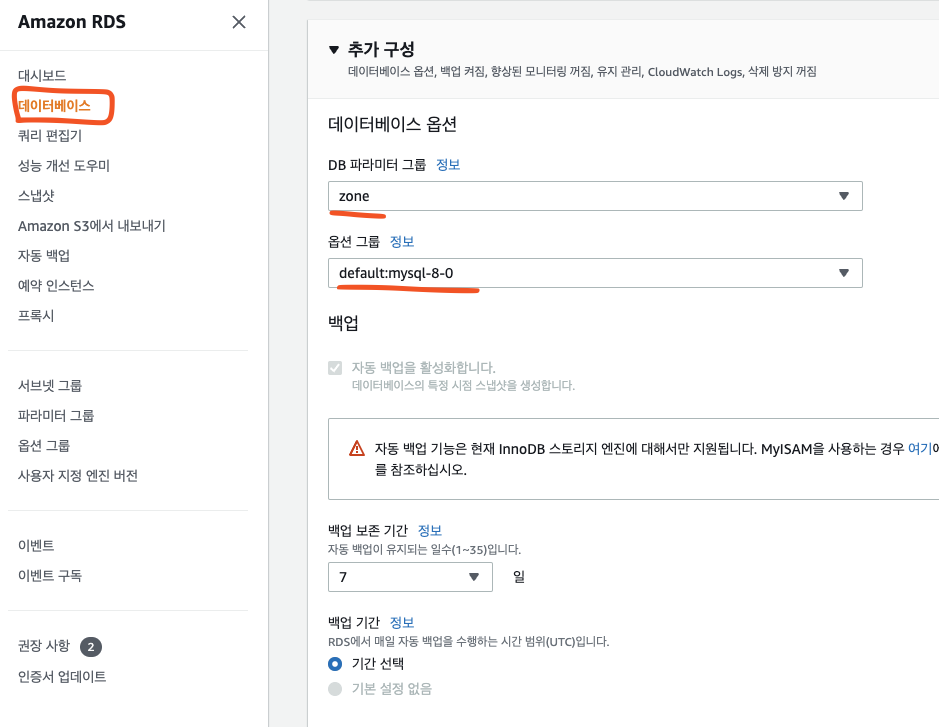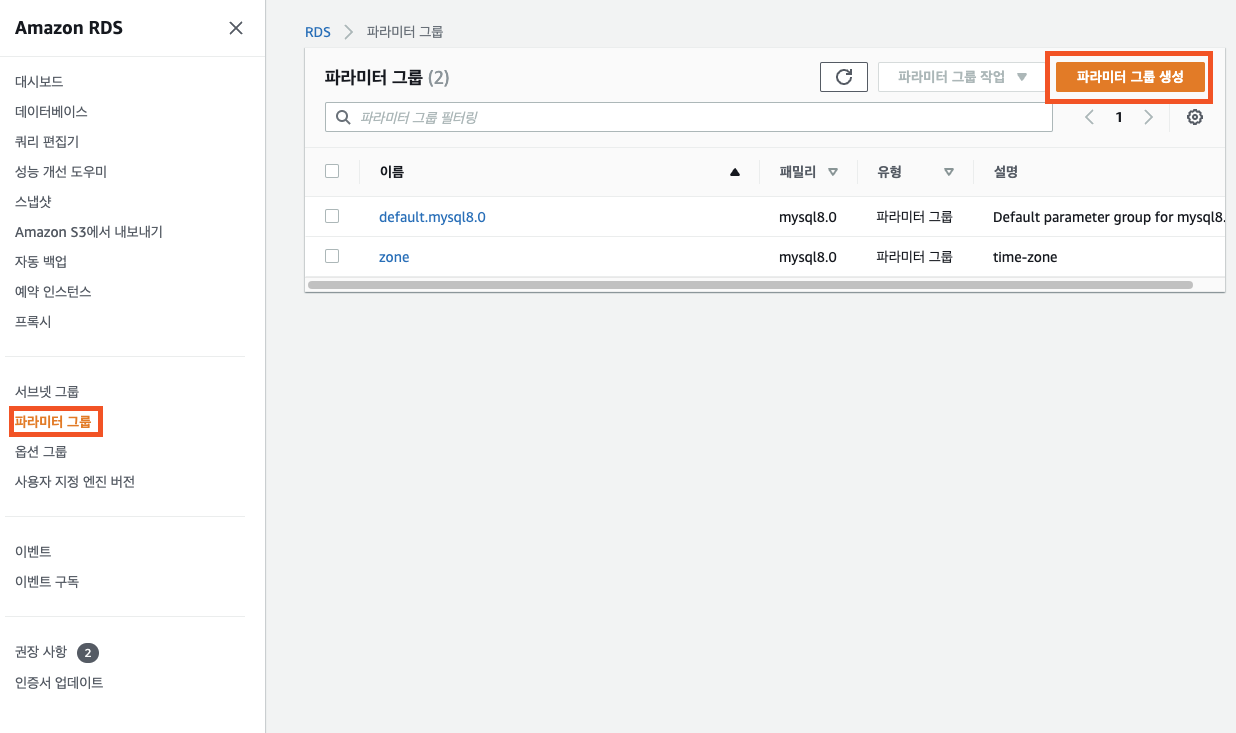 RDS에서 파라미터 그룹을 생성해야 합니다.